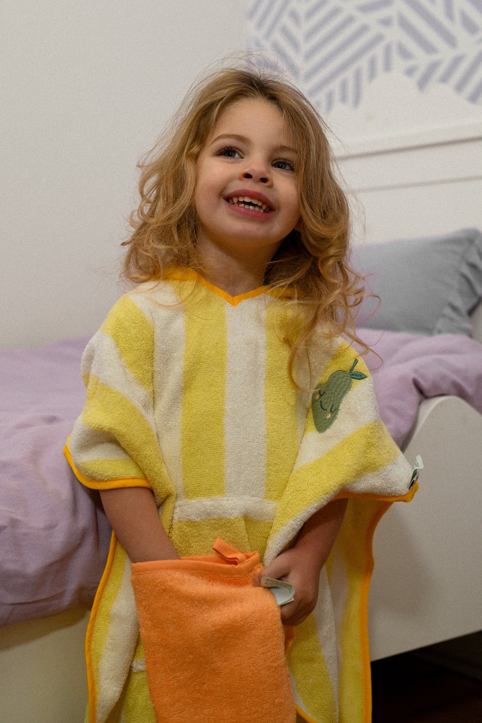 Make bath time fun with the Pedro the Pear poncho! This playful poncho, shaped like a sweet pear, is perfect for keeping your little one warm and dry, whether at home, the beach, or the pool.