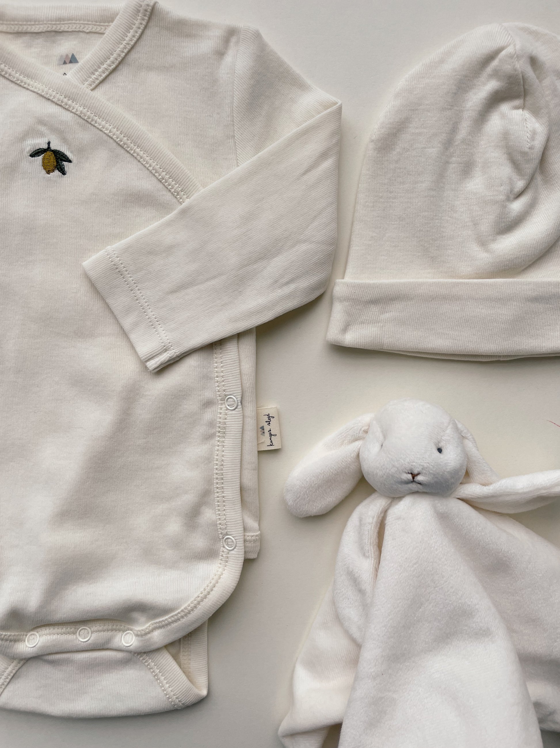 Thoughtful maternity package for new parents. Features a soft little hat, a bodystocking, and a comforting cuddle bunny cloth for the new baby. Comes in a decorative gift box. Hat and body are made in 100% organic cotton. The cuddle cloth is made in 100% polyester.
